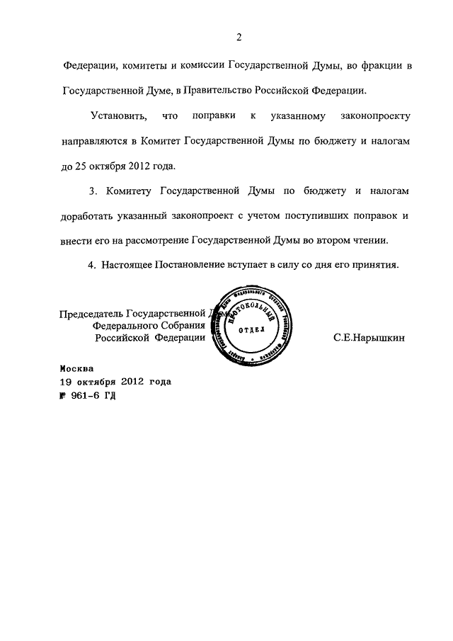 ПОСТАНОВЛЕНИЕ ГД ФС РФ от 19.10.2012 N 961-6 ГД