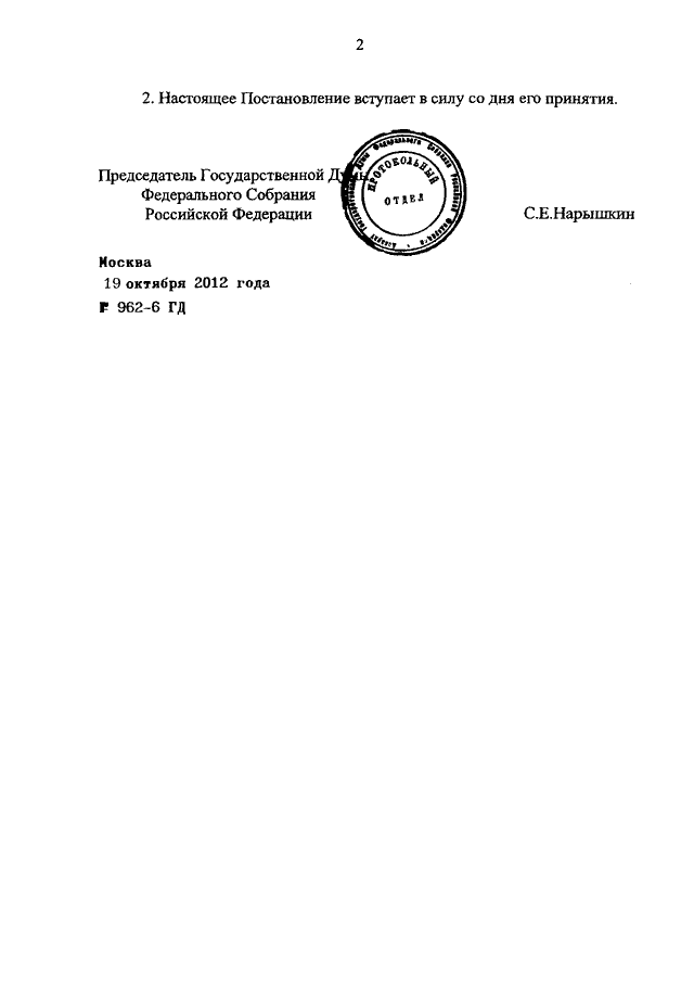 ПОСТАНОВЛЕНИЕ ГД ФС РФ от 19.10.2012 N 962-6 ГД
