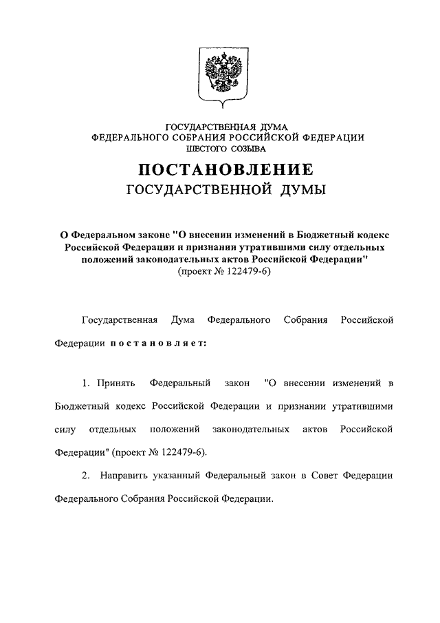 "О ФЕДЕРАЛЬНОМ ЗАКОНЕ "О ВНЕСЕНИИ ИЗМЕНЕНИЙ В БЮДЖЕТНЫЙ КОДЕКС РОССИЙСКОЙ ФЕДЕРАЦИИ И ПРИЗНАНИИ УТРАТИВШИМИ СИЛУ ОТДЕЛЬНЫХ ПОЛОЖЕНИЙ ЗАКОНОДАТЕЛЬНЫХ АКТОВ РОССИЙСКОЙ ФЕДЕРАЦИИ" (ПРОЕКТ N 122479-6)"