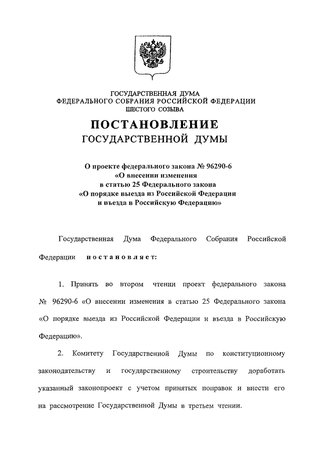 "О ПРОЕКТЕ ФЕДЕРАЛЬНОГО ЗАКОНА N 96290-6 "О ВНЕСЕНИИ ИЗМЕНЕНИЯ В СТАТЬЮ 25 ФЕДЕРАЛЬНОГО ЗАКОНА "О ПОРЯДКЕ ВЫЕЗДА ИЗ РОССИЙСКОЙ ФЕДЕРАЦИИ И ВЪЕЗДА В РОССИЙСКУЮ ФЕДЕРАЦИЮ"