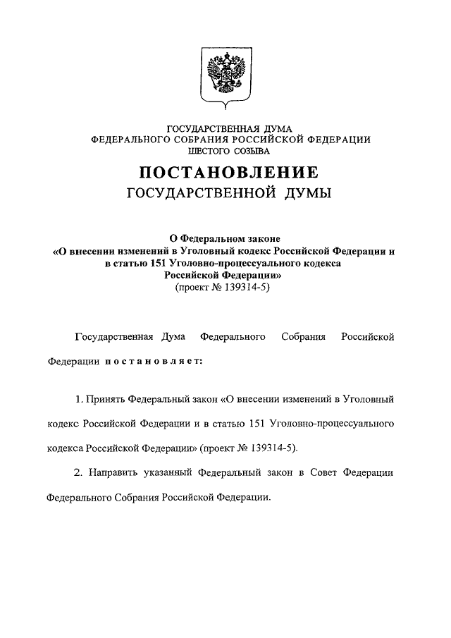 "О ФЕДЕРАЛЬНОМ ЗАКОНЕ "О ВНЕСЕНИИ ИЗМЕНЕНИЙ В УГОЛОВНЫЙ КОДЕКС РОССИЙСКОЙ ФЕДЕРАЦИИ И В СТАТЬЮ 151 УГОЛОВНО - ПРОЦЕССУАЛЬНОГО КОДЕКСА РОССИЙСКОЙ ФЕДЕРАЦИИ" (ПРОЕКТ N 139314-5)"