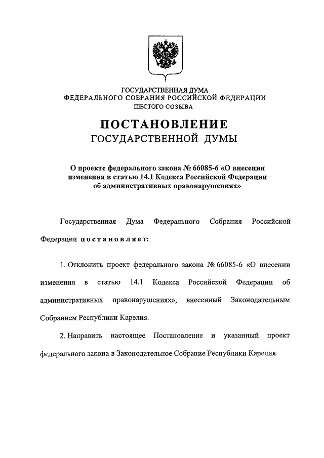 "О ПРОЕКТЕ ФЕДЕРАЛЬНОГО ЗАКОНА N 66085-6 "О ВНЕСЕНИИ ИЗМЕНЕНИЯ В СТАТЬЮ 14.1 КОДЕКСА РОССИЙСКОЙ ФЕДЕРАЦИИ ОБ АДМИНИСТРАТИВНЫХ ПРАВОНАРУШЕНИЯХ"
