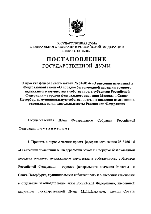 "О ПРОЕКТЕ ФЕДЕРАЛЬНОГО ЗАКОНА N 34601-6 "О ВНЕСЕНИИ ИЗМЕНЕНИЙ В