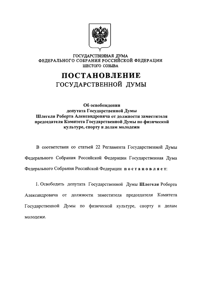"ОБ ОСВОБОЖДЕНИИ ДЕПУТАТА ГОСУДАРСТВЕННОЙ ДУМЫ ШЛЕГЕЛЯ РОБЕРТА АЛЕКСАНДРОВИЧА ОТ ДОЛЖНОСТИ ЗАМЕСТИТЕЛЯ ПРЕДСЕДАТЕЛЯ КОМИТЕТА ГОСУДАРСТВЕННОЙ ДУМЫ ПО ФИЗИЧЕСКОЙ КУЛЬТУРЕ, СПОРТУ И ДЕЛАМ МОЛОДЕЖИ"