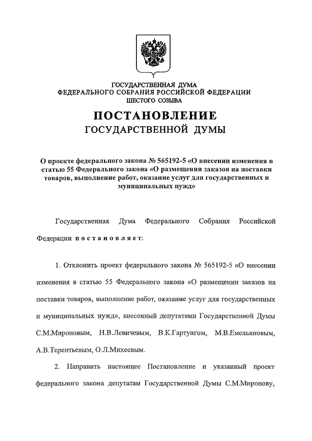"О ПРОЕКТЕ ФЕДЕРАЛЬНОГО ЗАКОНА N 565192-5 "О ВНЕСЕНИИ ИЗМЕНЕНИЯ В