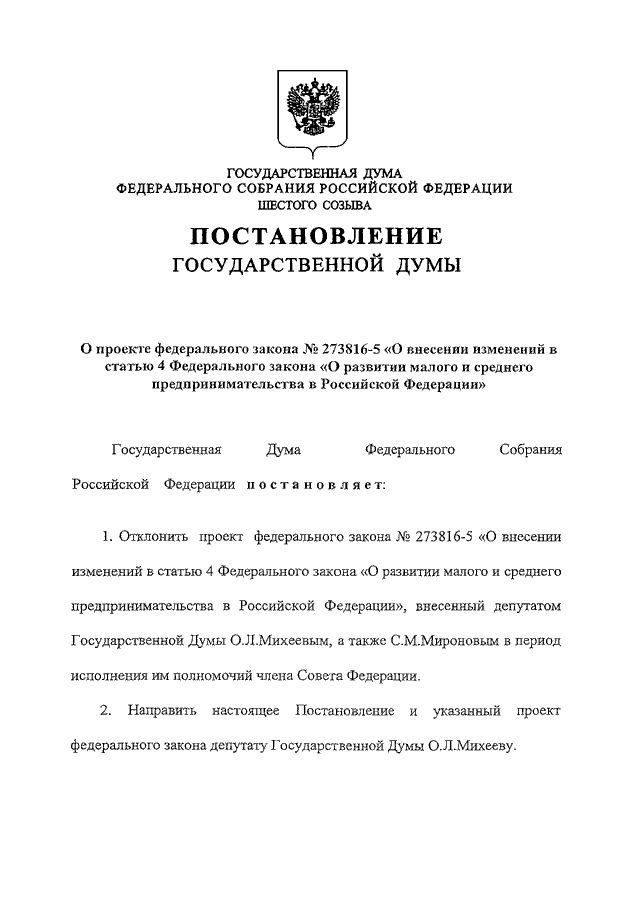 "О ПРОЕКТЕ ФЕДЕРАЛЬНОГО ЗАКОНА N 273816-5 "О ВНЕСЕНИИ ИЗМЕНЕНИЙ В СТАТЬЮ 4 ФЕДЕРАЛЬНОГО ЗАКОНА "О РАЗВИТИИ МАЛОГО И СРЕДНЕГО ПРЕДПРИНИМАТЕЛЬСТВА В РОССИЙСКОЙ ФЕДЕРАЦИИ"