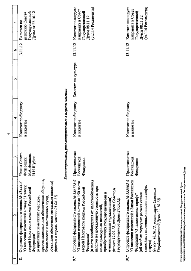 "О КАЛЕНДАРЕ РАССМОТРЕНИЯ ВОПРОСОВ ГОСУДАРСТВЕННОЙ ДУМОЙ С 13 ПО 23 НОЯБРЯ 2012 ГОДА"