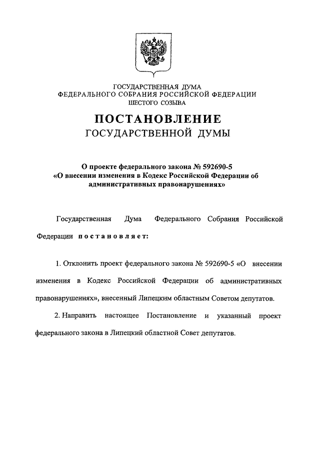 "О ПРОЕКТЕ ФЕДЕРАЛЬНОГО ЗАКОНА N 592690-5 "О ВНЕСЕНИИ ИЗМЕНЕНИЯ В КОДЕКС РОССИЙСКОЙ ФЕДЕРАЦИИ ОБ АДМИНИСТРАТИВНЫХ ПРАВОНАРУШЕНИЯХ"