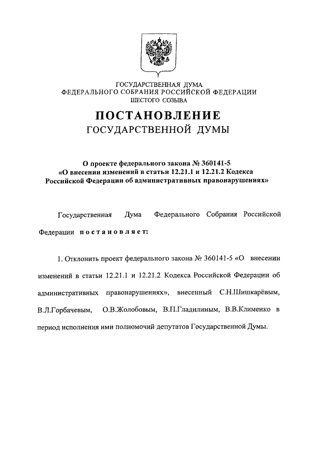 "О ПРОЕКТЕ ФЕДЕРАЛЬНОГО ЗАКОНА N 360141-5 "О ВНЕСЕНИИ ИЗМЕНЕНИЙ В СТАТЬИ 12.21.1 И 12.21.2 КОДЕКСА РОССИЙСКОЙ ФЕДЕРАЦИИ ОБ АДМИНИСТРАТИВНЫХ ПРАВОНАРУШЕНИЯХ"