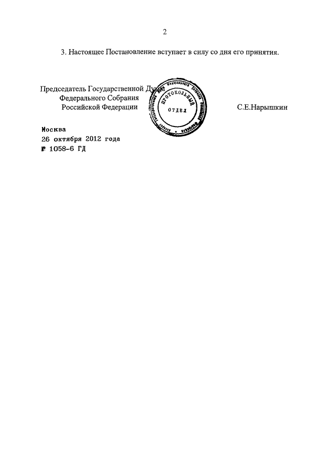 ПОСТАНОВЛЕНИЕ ГД ФС РФ от 26.10.2012 N 1058-6 ГД