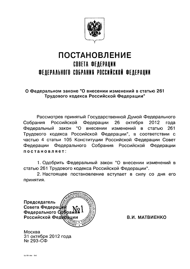 ПОСТАНОВЛЕНИЕ СФ ФС РФ от 31.10.2012 N 293-СФ