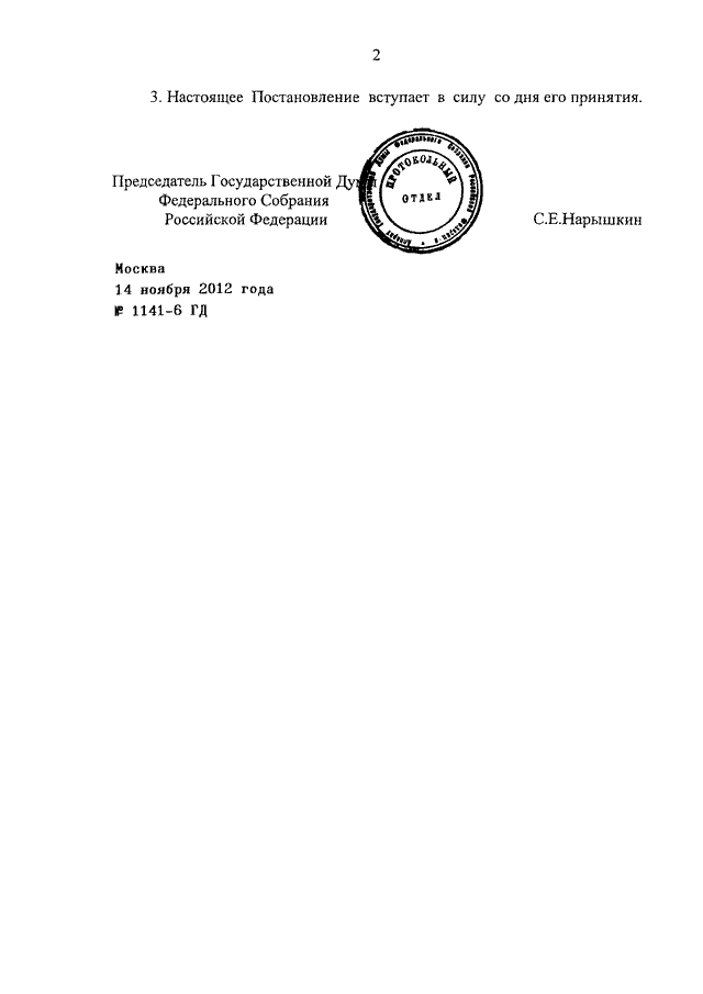 ПОСТАНОВЛЕНИЕ ГД ФС РФ от 14.11.2012 N 1141-6 ГД