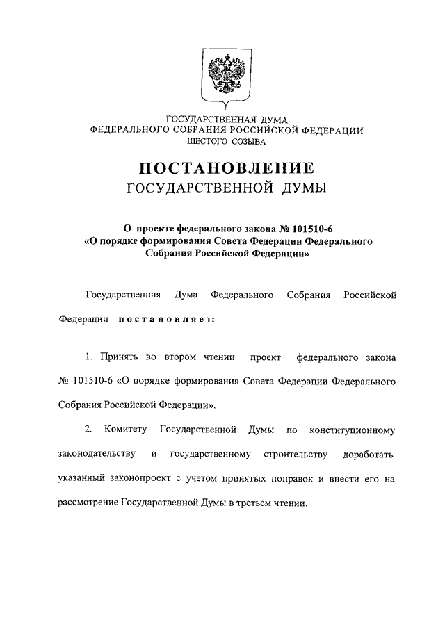 "О ПРОЕКТЕ ФЕДЕРАЛЬНОГО ЗАКОНА N 101510-6 "О ПОРЯДКЕ ФОРМИРОВАНИЯ СОВЕТА ФЕДЕРАЦИИ ФЕДЕРАЛЬНОГО СОБРАНИЯ РОССИЙСКОЙ ФЕДЕРАЦИИ"