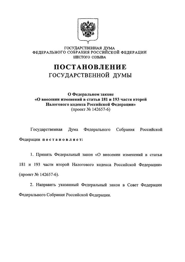 "О ФЕДЕРАЛЬНОМ ЗАКОНЕ "О ВНЕСЕНИИ ИЗМЕНЕНИЙ В СТАТЬИ 181 И 193 ЧАСТИ ВТОРОЙ НАЛОГОВОГО КОДЕКСА РОССИЙСКОЙ ФЕДЕРАЦИИ" (ПРОЕКТ N 142657-6)"