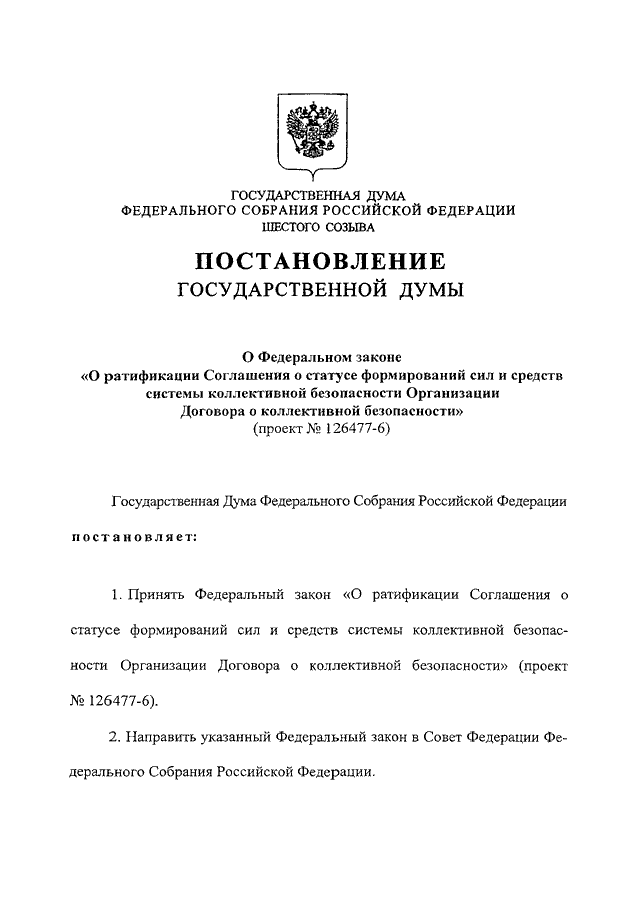 "О ФЕДЕРАЛЬНОМ ЗАКОНЕ "О РАТИФИКАЦИИ СОГЛАШЕНИЯ О СТАТУСЕ ФОРМИРОВАНИЙ СИЛ И СРЕДСТВ СИСТЕМЫ КОЛЛЕКТИВНОЙ БЕЗОПАСНОСТИ ОРГАНИЗАЦИИ ДОГОВОРА О КОЛЛЕКТИВНОЙ БЕЗОПАСНОСТИ" (ПРОЕКТ N 126477-6)"