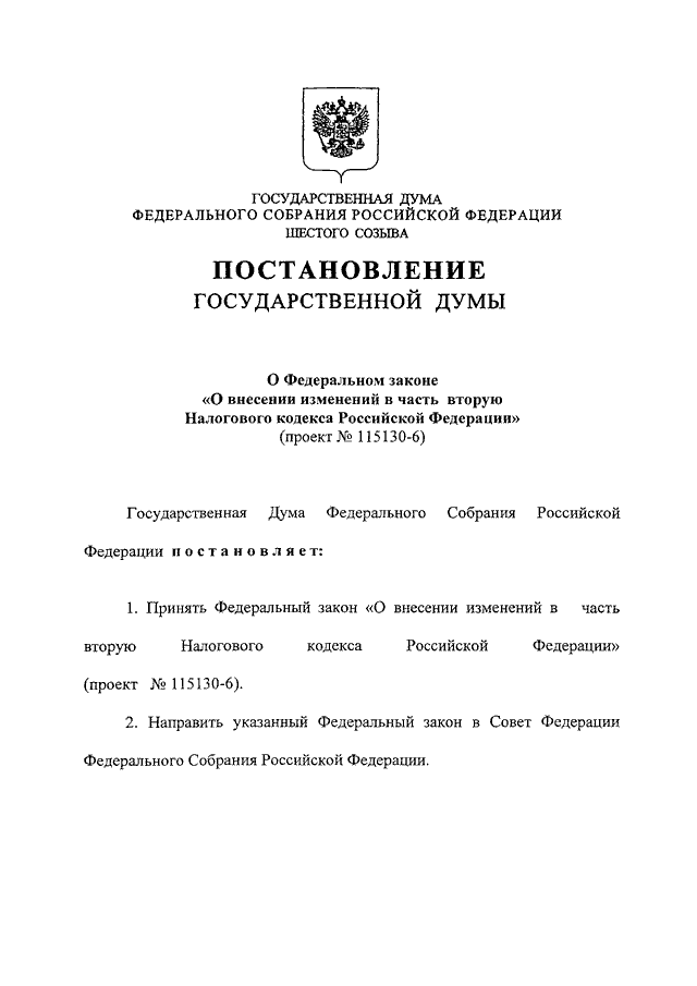 "О ФЕДЕРАЛЬНОМ ЗАКОНЕ "О ВНЕСЕНИИ ИЗМЕНЕНИЙ В ЧАСТЬ ВТОРУЮ НАЛОГОВОГО КОДЕКСА РОССИЙСКОЙ ФЕДЕРАЦИИ" (ПРОЕКТ N 115130-6)"