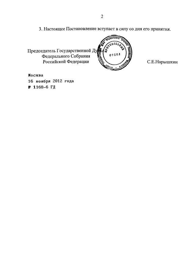 ПОСТАНОВЛЕНИЕ ГД ФС РФ от 16.11.2012 N 1168-6 ГД