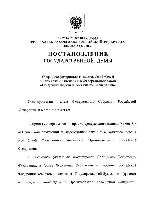 "О ПРОЕКТЕ ФЕДЕРАЛЬНОГО ЗАКОНА N 136058-6 "О ВНЕСЕНИИ ИЗМЕНЕНИЙ В ФЕДЕРАЛЬНЫЙ ЗАКОН "ОБ АРХИВНОМ ДЕЛЕ В РОССИЙСКОЙ ФЕДЕРАЦИИ"