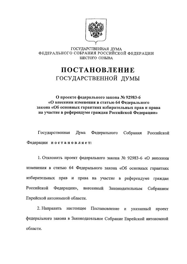 "О ПРОЕКТЕ ФЕДЕРАЛЬНОГО ЗАКОНА N 92983-6 "О ВНЕСЕНИИ ИЗМЕНЕНИЯ В СТАТЬЮ 64 ФЕДЕРАЛЬНОГО ЗАКОНА "ОБ ОСНОВНЫХ ГАРАНТИЯХ ИЗБИРАТЕЛЬНЫХ ПРАВ И ПРАВА НА УЧАСТИЕ В РЕФЕРЕНДУМЕ ГРАЖДАН РОССИЙСКОЙ ФЕДЕРАЦИИ"