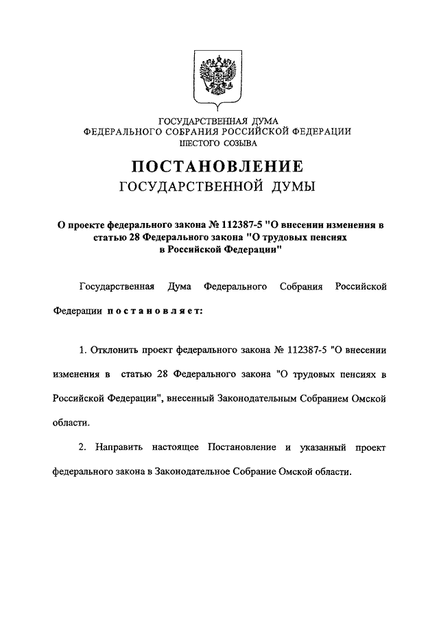 "О ПРОЕКТЕ ФЕДЕРАЛЬНОГО ЗАКОНА N 112387-5 "О ВНЕСЕНИИ ИЗМЕНЕНИЯ В СТАТЬЮ 28 ФЕДЕРАЛЬНОГО ЗАКОНА "О ТРУДОВЫХ ПЕНСИЯХ В РОССИЙСКОЙ ФЕДЕРАЦИИ"