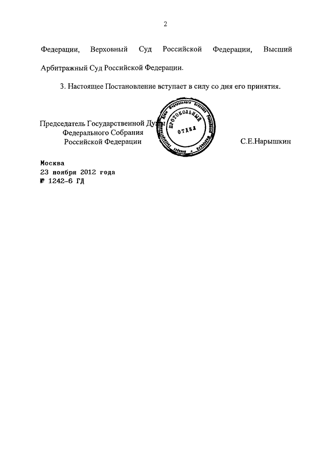 ПОСТАНОВЛЕНИЕ ГД ФС РФ от 23.11.2012 N 1242-6 ГД