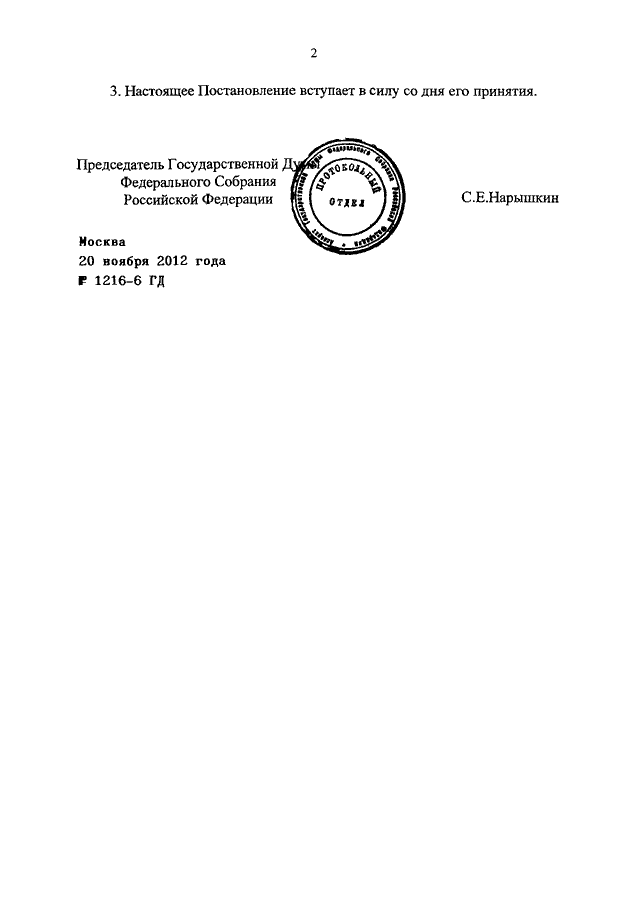 ПОСТАНОВЛЕНИЕ ГД ФС РФ от 20.11.2012 N 1216-6 ГД