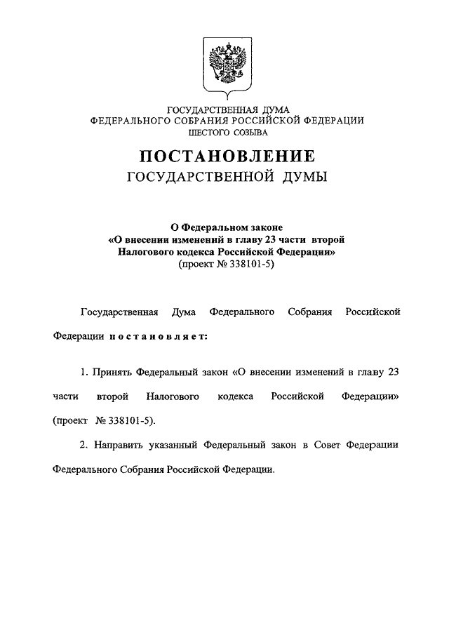 "О ФЕДЕРАЛЬНОМ ЗАКОНЕ "О ВНЕСЕНИИ ИЗМЕНЕНИЙ В ГЛАВУ 23 ЧАСТИ ВТОРОЙ НАЛОГОВОГО КОДЕКСА РОССИЙСКОЙ ФЕДЕРАЦИИ" (ПРОЕКТ N 338101-5)"