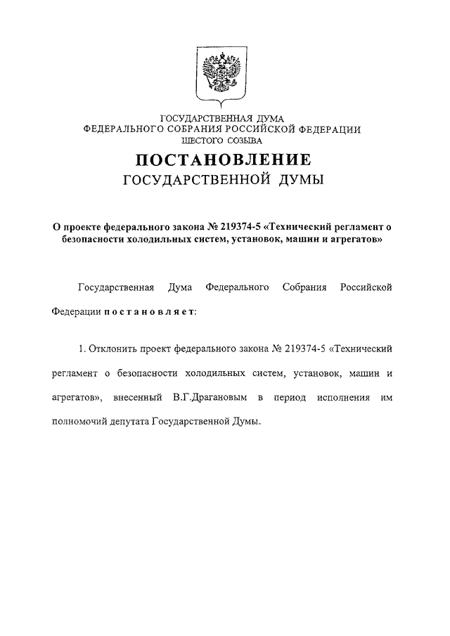 "О ПРОЕКТЕ ФЕДЕРАЛЬНОГО ЗАКОНА N 219374-5 "ТЕХНИЧЕСКИЙ РЕГЛАМЕНТ О БЕЗОПАСНОСТИ ХОЛОДИЛЬНЫХ СИСТЕМ, УСТАНОВОК, МАШИН И АГРЕГАТОВ"