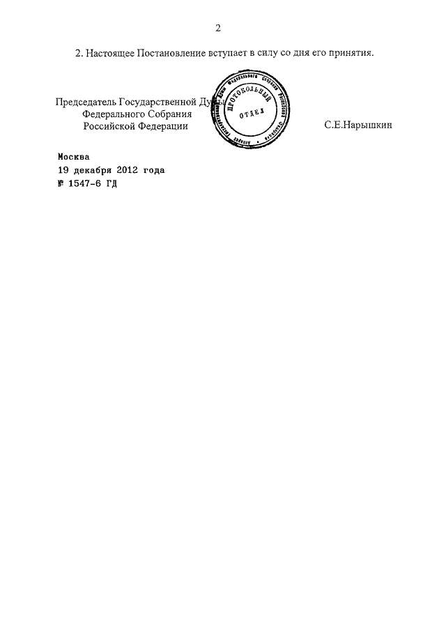 ПОСТАНОВЛЕНИЕ ГД ФС РФ от 19.12.2012 N 1547-6 ГД