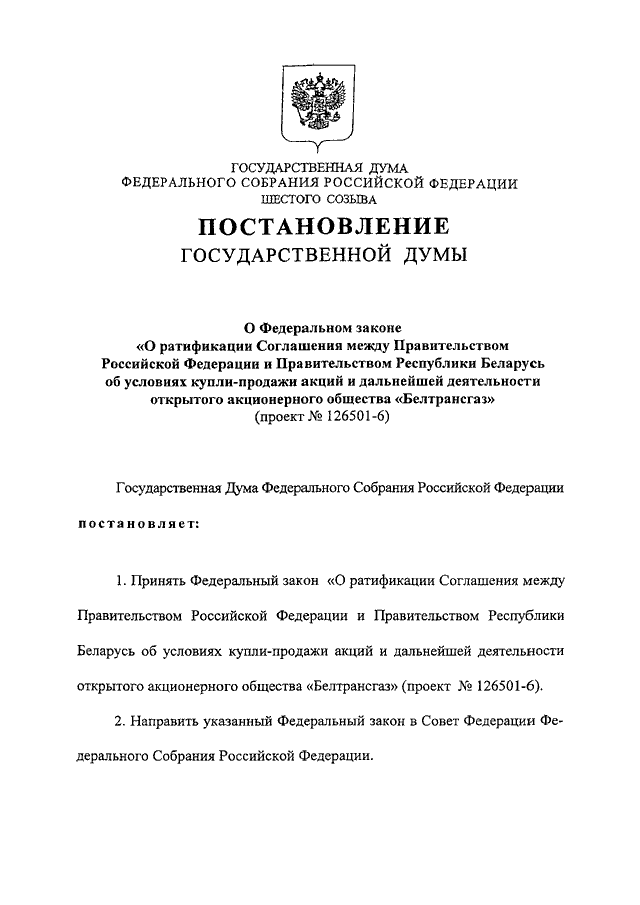 "О ФЕДЕРАЛЬНОМ ЗАКОНЕ "О РАТИФИКАЦИИ СОГЛАШЕНИЯ МЕЖДУ ПРАВИТЕЛЬСТВОМ РОССИЙСКОЙ ФЕДЕРАЦИИ И ПРАВИТЕЛЬСТВОМ РЕСПУБЛИКИ БЕЛАРУСЬ ОБ УСЛОВИЯХ КУПЛИ - ПРОДАЖИ АКЦИЙ И ДАЛЬНЕЙШЕЙ ДЕЯТЕЛЬНОСТИ ОТКРЫТОГО АКЦИОНЕРНОГО ОБЩЕСТВА "БЕЛТРАНСГАЗ" (ПРОЕКТ N 126501-6)"