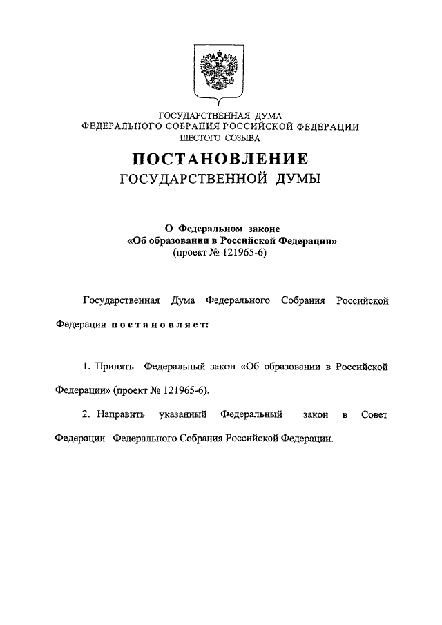 "О ФЕДЕРАЛЬНОМ ЗАКОНЕ "ОБ ОБРАЗОВАНИИ В РОССИЙСКОЙ ФЕДЕРАЦИИ" (ПРОЕКТ N 121965-6)"