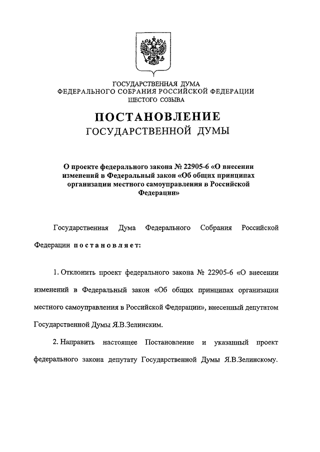 "О ПРОЕКТЕ ФЕДЕРАЛЬНОГО ЗАКОНА N 22905-6 "О ВНЕСЕНИИ ИЗМЕНЕНИЙ В ФЕДЕРАЛЬНЫЙ ЗАКОН "ОБ ОБЩИХ ПРИНЦИПАХ ОРГАНИЗАЦИИ МЕСТНОГО САМОУПРАВЛЕНИЯ В РОССИЙСКОЙ ФЕДЕРАЦИИ"