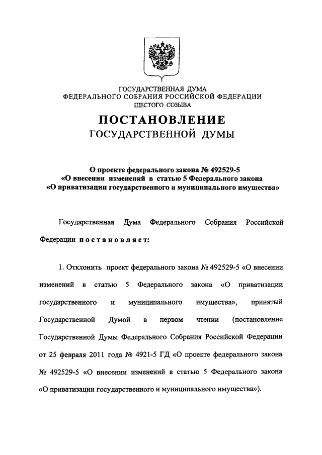 "О ПРОЕКТЕ ФЕДЕРАЛЬНОГО ЗАКОНА N 492529-5 "О ВНЕСЕНИИ ИЗМЕНЕНИЙ В СТАТЬЮ 5 ФЕДЕРАЛЬНОГО ЗАКОНА "О ПРИВАТИЗАЦИИ ГОСУДАРСТВЕННОГО И МУНИЦИПАЛЬНОГО ИМУЩЕСТВА"