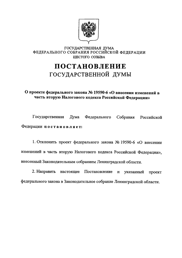 "О ПРОЕКТЕ ФЕДЕРАЛЬНОГО ЗАКОНА N 19590-6 "О ВНЕСЕНИИ ИЗМЕНЕНИЙ В ЧАСТЬ ВТОРУЮ НАЛОГОВОГО КОДЕКСА РОССИЙСКОЙ ФЕДЕРАЦИИ"