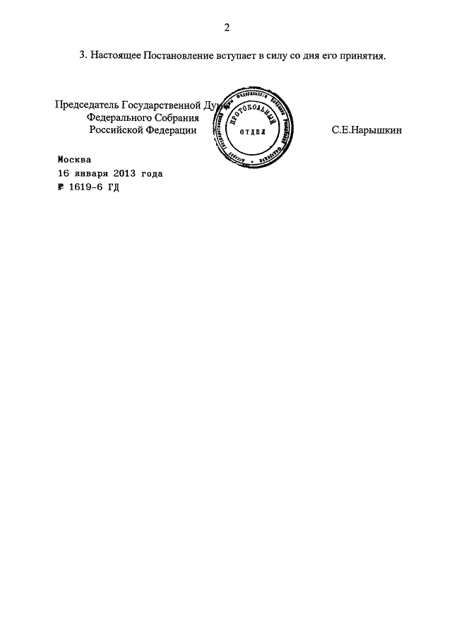 ПОСТАНОВЛЕНИЕ ГД ФС РФ от 16.01.2013 N 1619-6 ГД