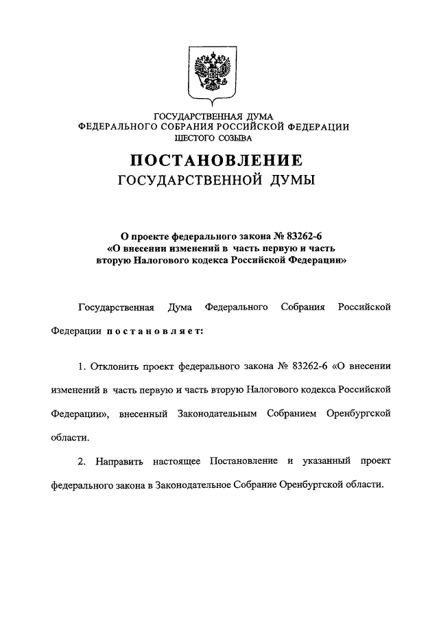 "О ПРОЕКТЕ ФЕДЕРАЛЬНОГО ЗАКОНА N 83262-6 "О ВНЕСЕНИИ ИЗМЕНЕНИЙ В ЧАСТЬ ПЕРВУЮ И ЧАСТЬ ВТОРУЮ НАЛОГОВОГО КОДЕКСА РОССИЙСКОЙ ФЕДЕРАЦИИ"