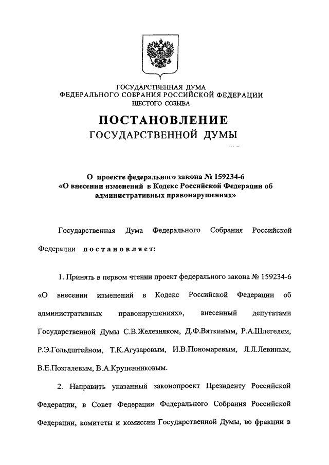 "О ПРОЕКТЕ ФЕДЕРАЛЬНОГО ЗАКОНА N 159234-6 "О ВНЕСЕНИИ ИЗМЕНЕНИЙ В КОДЕКС РОССИЙСКОЙ ФЕДЕРАЦИИ ОБ АДМИНИСТРАТИВНЫХ ПРАВОНАРУШЕНИЯХ"