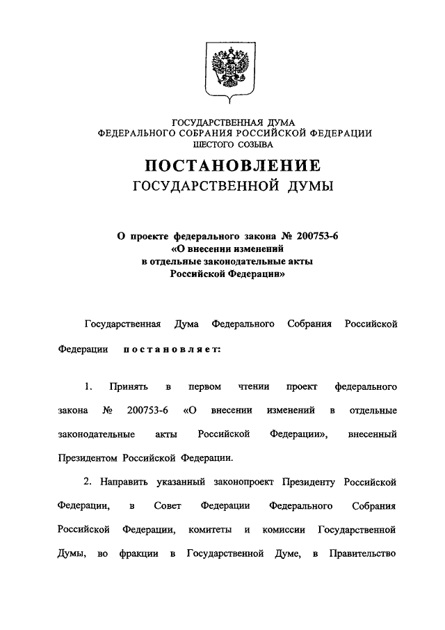 "О ПРОЕКТЕ ФЕДЕРАЛЬНОГО ЗАКОНА N 200753-6 "О ВНЕСЕНИИ ИЗМЕНЕНИЙ В ОТДЕЛЬНЫЕ ЗАКОНОДАТЕЛЬНЫЕ АКТЫ РОССИЙСКОЙ ФЕДЕРАЦИИ"