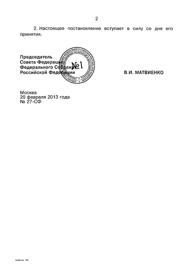 ПОСТАНОВЛЕНИЕ СФ ФС РФ от 20.02.2013 N 27-СФ