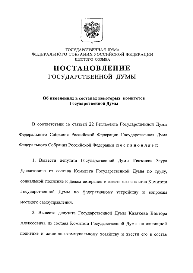 "ОБ ИЗМЕНЕНИЯХ В СОСТАВАХ НЕКОТОРЫХ КОМИТЕТОВ ГОСУДАРСТВЕННОЙ ДУМЫ"