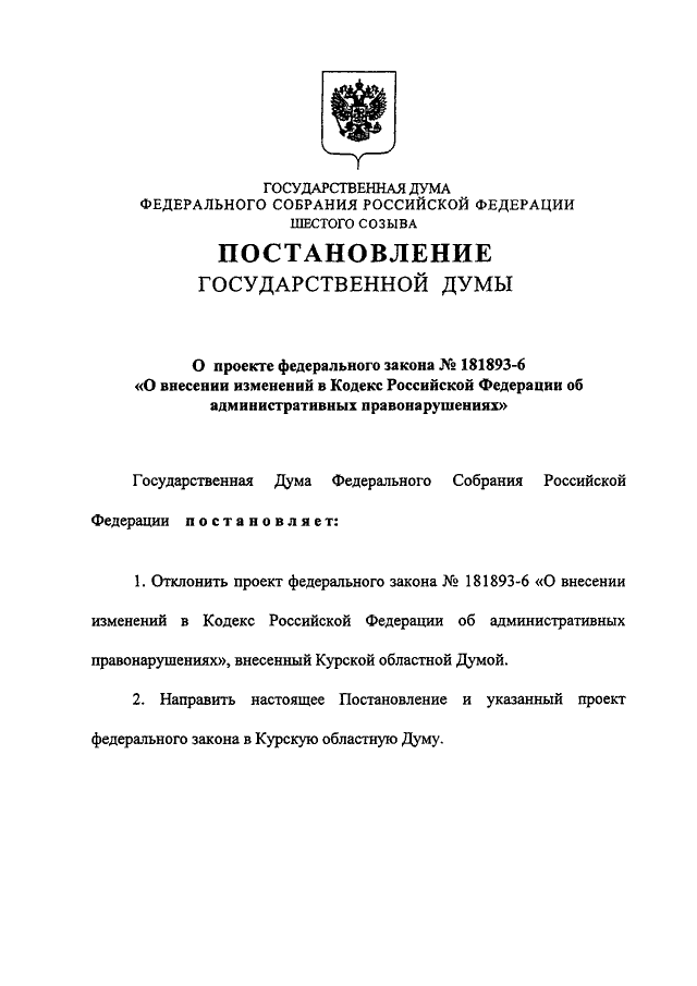 "О ПРОЕКТЕ ФЕДЕРАЛЬНОГО ЗАКОНА N 181893-6 "О ВНЕСЕНИИ ИЗМЕНЕНИЙ В КОДЕКС РОССИЙСКОЙ ФЕДЕРАЦИИ ОБ АДМИНИСТРАТИВНЫХ ПРАВОНАРУШЕНИЯХ"