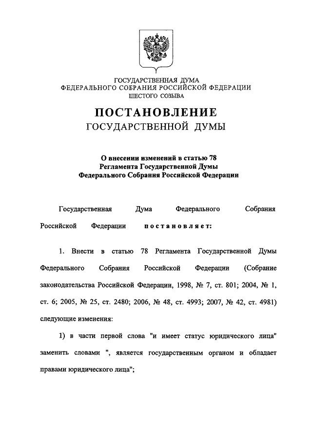 "О ВНЕСЕНИИ ИЗМЕНЕНИЙ В СТАТЬЮ 78 РЕГЛАМЕНТА ГОСУДАРСТВЕННОЙ ДУМЫ ФЕДЕРАЛЬНОГО СОБРАНИЯ РОССИЙСКОЙ ФЕДЕРАЦИИ"