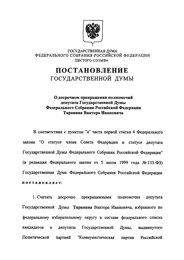"О ДОСРОЧНОМ ПРЕКРАЩЕНИИ ПОЛНОМОЧИЙ ДЕПУТАТА ГОСУДАРСТВЕННОЙ ДУМЫ ФЕДЕРАЛЬНОГО СОБРАНИЯ РОССИЙСКОЙ ФЕДЕРАЦИИ ТАРАНИНА ВИКТОРА ИВАНОВИЧА"
