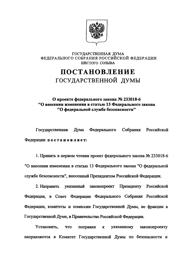 "О ПРОЕКТЕ ФЕДЕРАЛЬНОГО ЗАКОНА N 233018-6 "О ВНЕСЕНИИ ИЗМЕНЕНИЯ В СТАТЬЮ 13 ФЕДЕРАЛЬНОГО ЗАКОНА "О ФЕДЕРАЛЬНОЙ СЛУЖБЕ БЕЗОПАСНОСТИ"