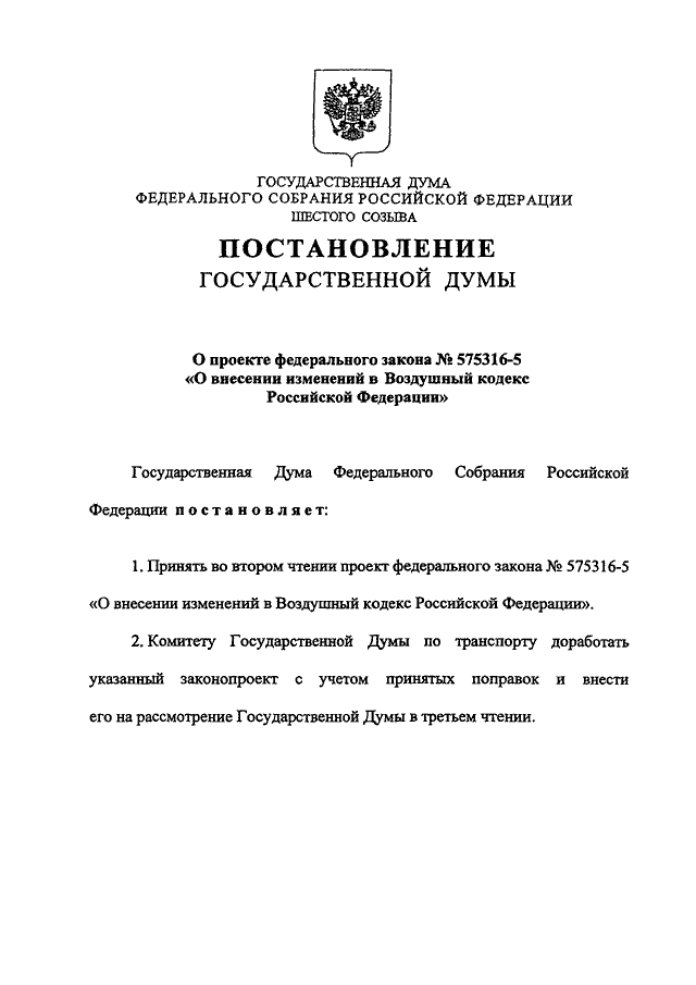 "О ПРОЕКТЕ ФЕДЕРАЛЬНОГО ЗАКОНА N 575316-5 "О ВНЕСЕНИИ ИЗМЕНЕНИЙ В ВОЗДУШНЫЙ КОДЕКС РОССИЙСКОЙ ФЕДЕРАЦИИ"
