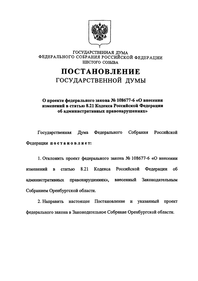 "О ПРОЕКТЕ ФЕДЕРАЛЬНОГО ЗАКОНА N 108677-6 "О ВНЕСЕНИИ ИЗМЕНЕНИЙ В СТАТЬЮ 8.21 КОДЕКСА РОССИЙСКОЙ ФЕДЕРАЦИИ ОБ АДМИНИСТРАТИВНЫХ ПРАВОНАРУШЕНИЯХ"