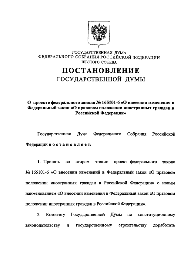 "О ПРОЕКТЕ ФЕДЕРАЛЬНОГО ЗАКОНА N 165101-6 "О ВНЕСЕНИИ ИЗМЕНЕНИЯ В ФЕДЕРАЛЬНЫЙ ЗАКОН "О ПРАВОВОМ ПОЛОЖЕНИИ ИНОСТРАННЫХ ГРАЖДАН В РОССИЙСКОЙ ФЕДЕРАЦИИ"