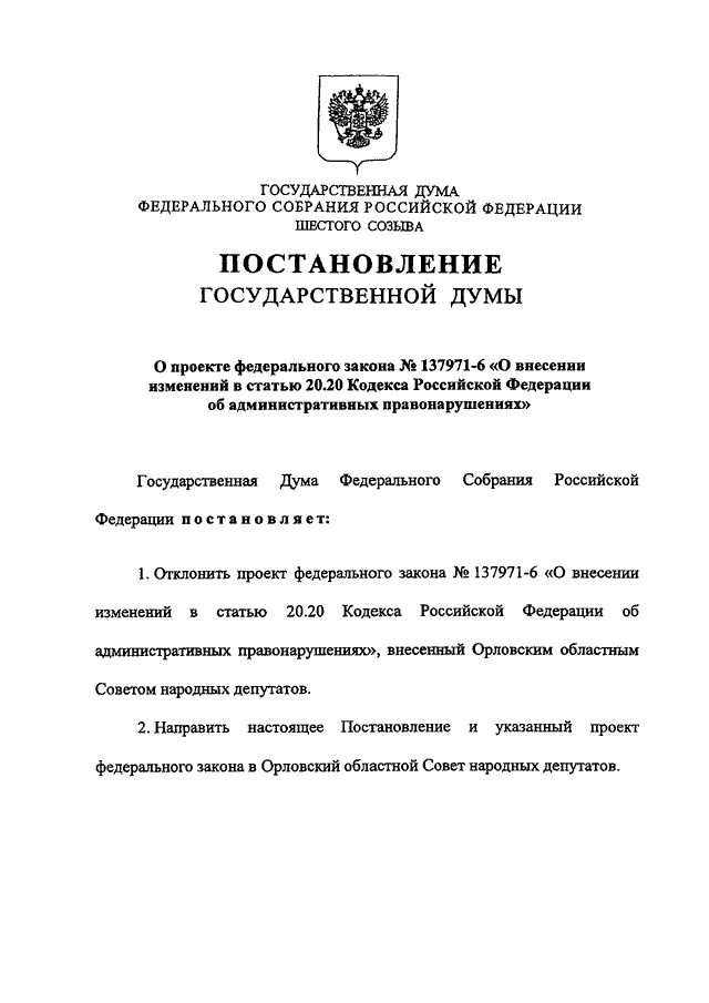 "О ПРОЕКТЕ ФЕДЕРАЛЬНОГО ЗАКОНА N 137971-6 "О ВНЕСЕНИИ ИЗМЕНЕНИЙ В СТАТЬЮ 20.20 КОДЕКСА РОССИЙСКОЙ ФЕДЕРАЦИИ ОБ АДМИНИСТРАТИВНЫХ ПРАВОНАРУШЕНИЯХ"