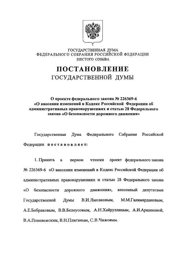 "О ПРОЕКТЕ ФЕДЕРАЛЬНОГО ЗАКОНА N 226369-6 "О ВНЕСЕНИИ ИЗМЕНЕНИЙ В КОДЕКС РОССИЙСКОЙ ФЕДЕРАЦИИ ОБ АДМИНИСТРАТИВНЫХ ПРАВОНАРУШЕНИЯХ И СТАТЬЮ 28 ФЕДЕРАЛЬНОГО ЗАКОНА "О БЕЗОПАСНОСТИ ДОРОЖНОГО ДВИЖЕНИЯ"