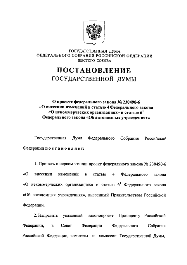 "О ПРОЕКТЕ ФЕДЕРАЛЬНОГО ЗАКОНА N 230490-6 "О ВНЕСЕНИИ ИЗМЕНЕНИЙ В СТАТЬЮ 4 ФЕДЕРАЛЬНОГО ЗАКОНА "О НЕКОММЕРЧЕСКИХ ОРГАНИЗАЦИЯХ" И СТАТЬЮ 6.1 ФЕДЕРАЛЬНОГО ЗАКОНА "ОБ АВТОНОМНЫХ УЧРЕЖДЕНИЯХ"